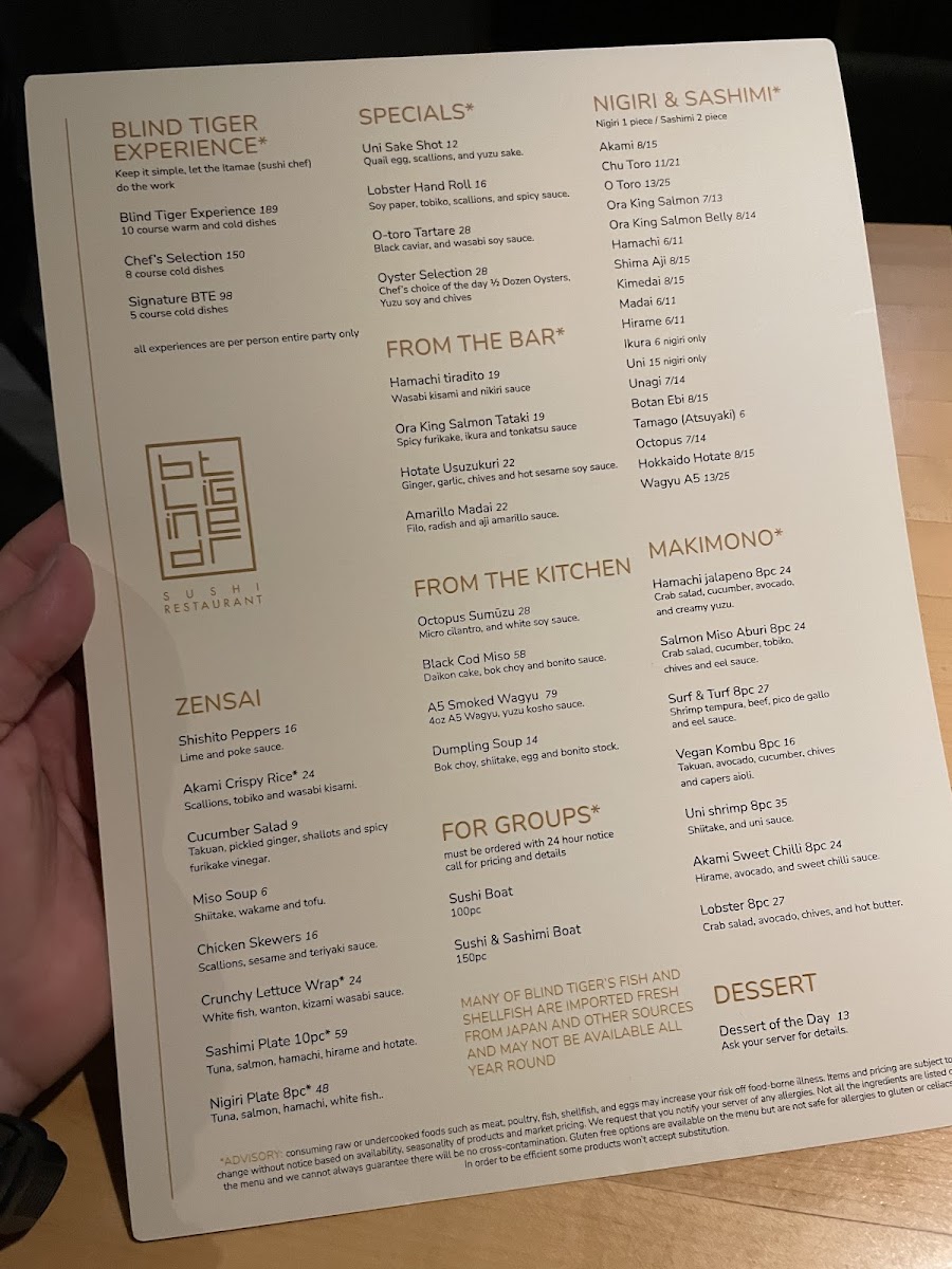 Blind Tiger Experience Aventura Menu